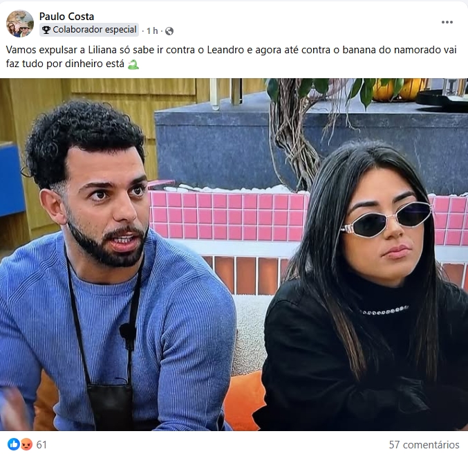 Segundo comentários publicados por seguidores, Liliana “só sabe ir contra o Leandro” e agora “até contra o namorado vai, faz tudo por dinheiro”. A crítica foi reforçada com o uso de emojis de serpente 🐍, simbolizando manipulação e atitudes estratégicas que têm desagradado parte do público.